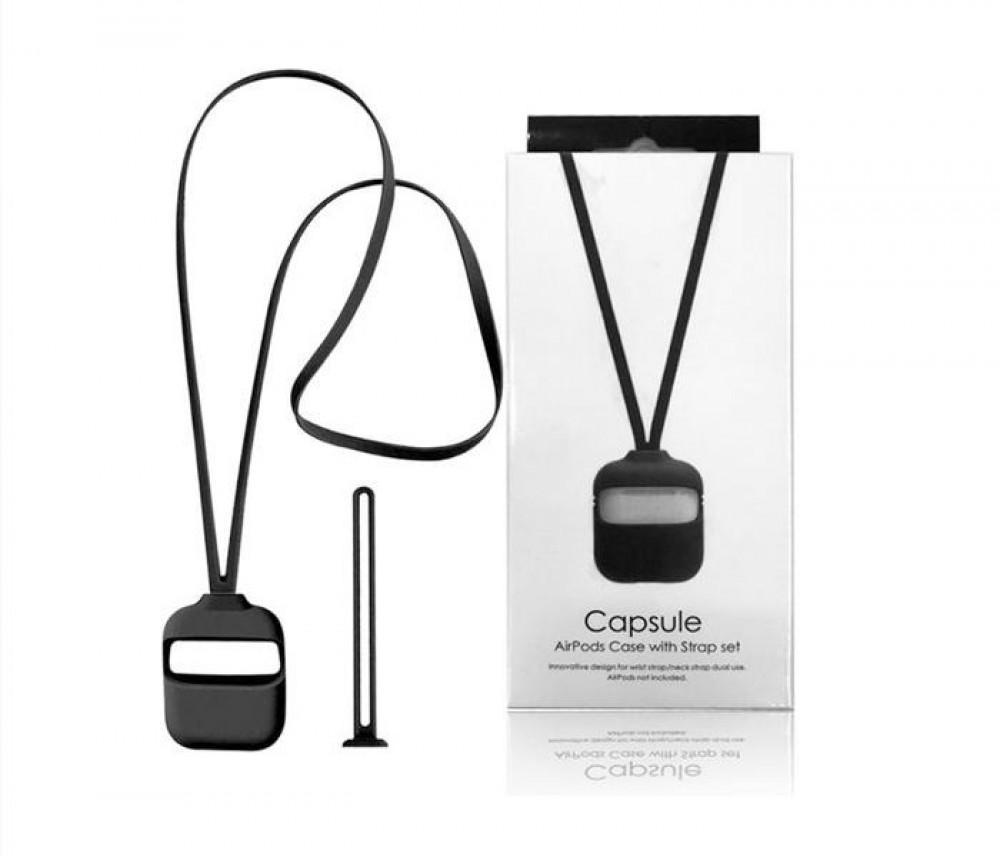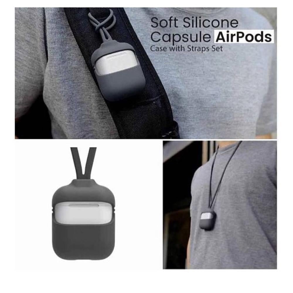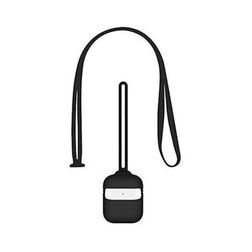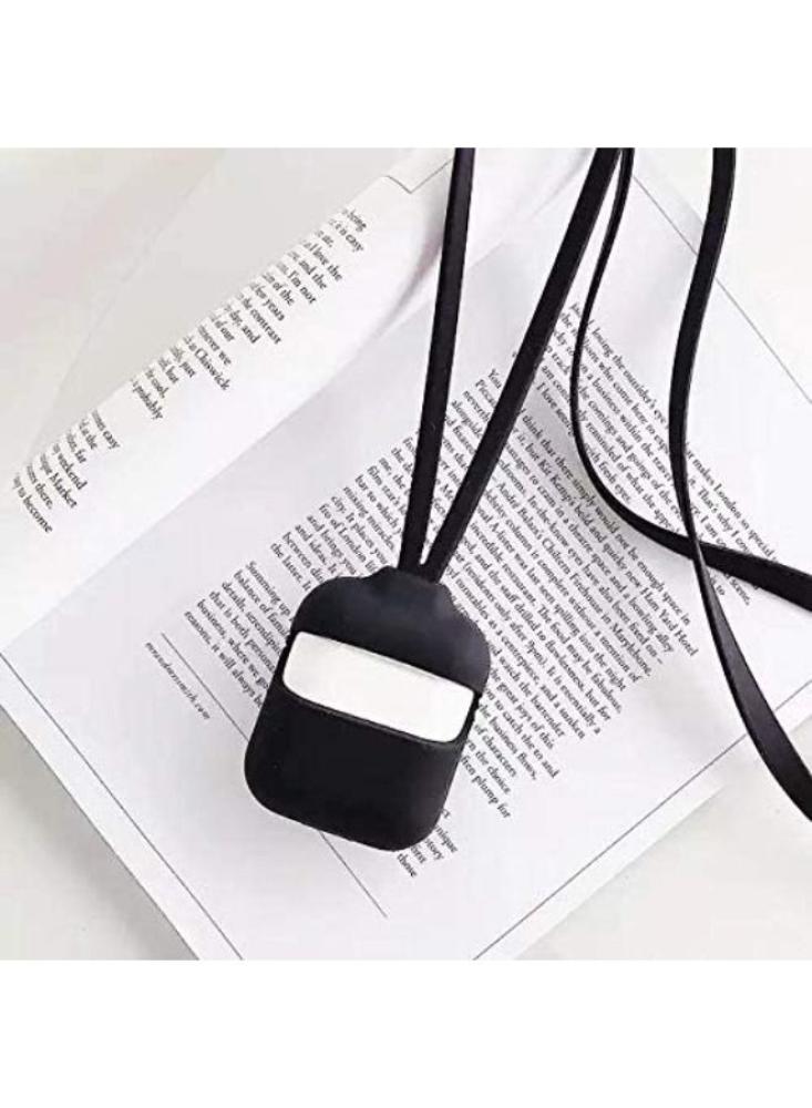 حافظة سيليكون متين لسماعات AirPods 1/2 بلون أسود أنيق، مزوّد بحزامي تعليق للرقبة للحماية وسهولة الحمل، مثالي للاستخدام اليومي والنشاطات.