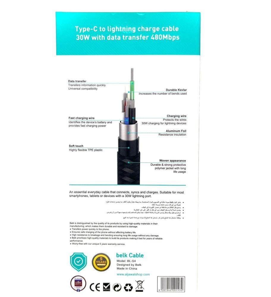 المنتج في الصورة هو كابل شحن من نوع USB-C إلى Lightning من شركة Belk.